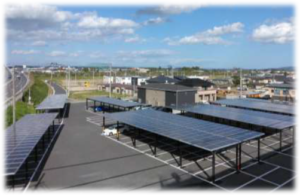 ☑ 高圧受電(6KⅤ)建物に併設の平面駐車場に複数設置し自家消費による光熱費の削減